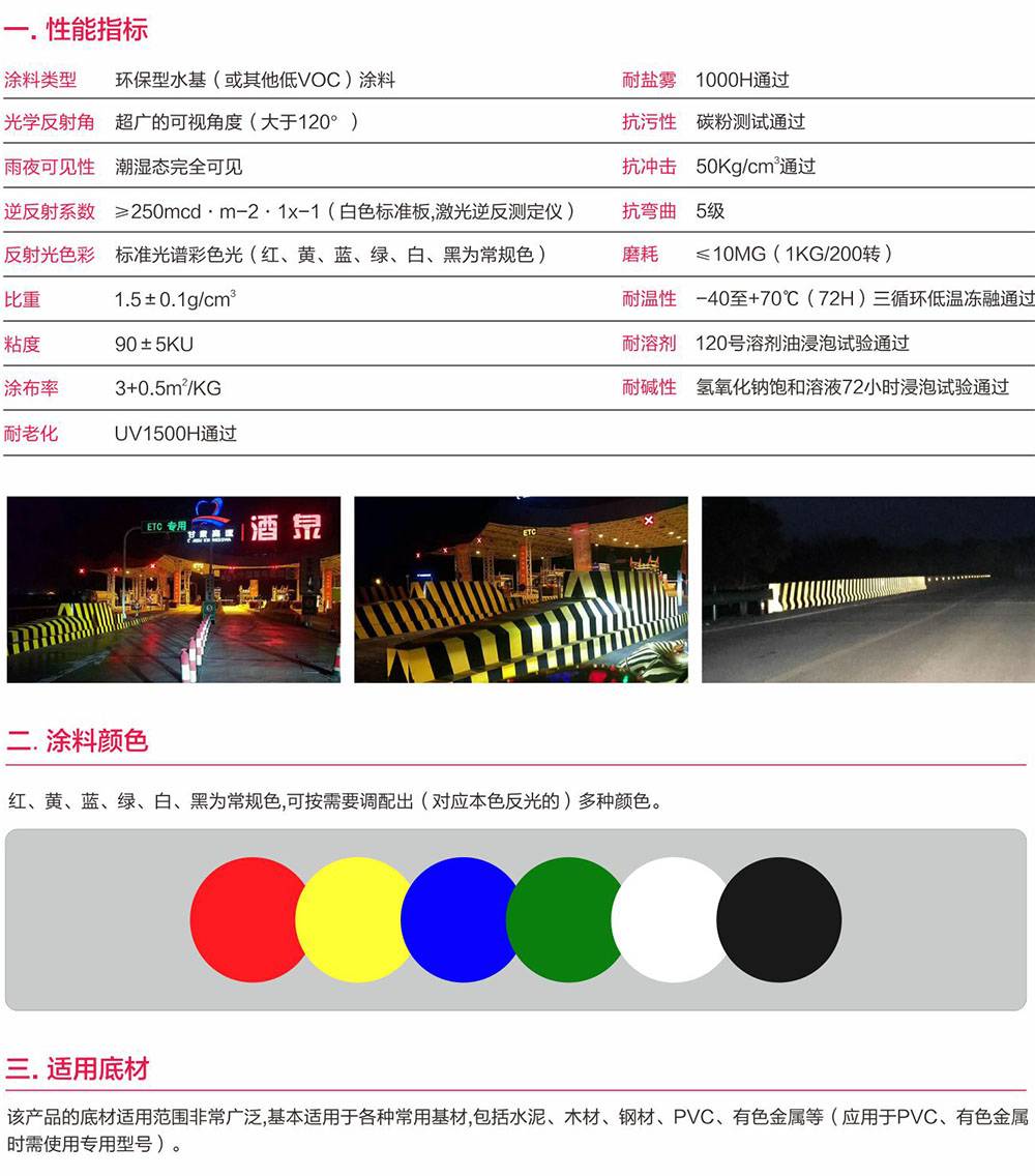 本产品是全新一代的超广角彩色(雨夜)反光立面标识涂料,是一款具备超广的可视反射角(大于120°)及高亮度的彩色反光标识涂料,同时具备较高的“雨夜”可见度和便捷的施工性,可以广泛应用于交通、车辆、海事、标识、彩绘、各种需要彩色反光的环境。