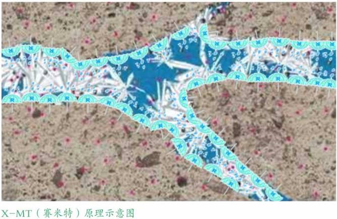 X-MT(赛米特)渗透结晶材料,是由普通硅酸盐水泥、石英砂和多种催化活性成分组成的渗透型无机材料。通过向混凝土内部渗透可增殖结晶性反应化合物,催化混凝土的微粒和未水化水泥的成分再次发生水化作用,而形成不溶性的枝蔓状晶体,同时与超疏水剂协同在混凝土毛细孔中形成半透型通道,既能提高混凝土抗渗性能,又能保持混凝土的透气性能,达到防水、防潮、增强混凝土结构强度的效果。X-MT(赛米特)渗透结晶材料可以有效提高水泥基材料的使用寿命,提升居住环境,是一种集防水、防潮、抗渗、防老化于一体的神奇材料。